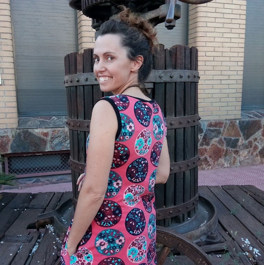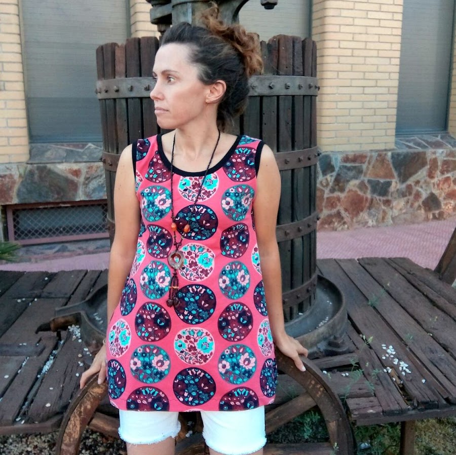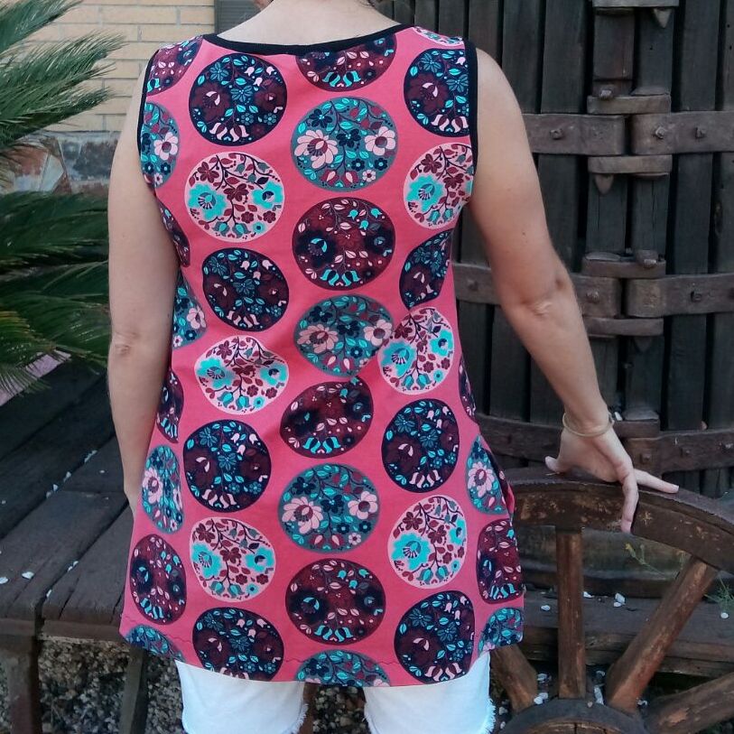 La idea era hacer un Relaxed (Ottobre) sin el bolsillo central, los bolsillos en la costura y sin mangas, sin cortes, pero esa media manga no me convencía, así que esta tarde le metí tijera, corté la media manguita y la dejé de tirantes.