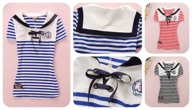 Entre todos sus productos yo escogí esta camiseta de estilo marinero o sailor tan de moda entre las lolitas y japonesas. Yo nunca me he vestido de Lolita pero esta camiseta es muy ponible y combinable con la ropa de diario. La puedes usar para crear un estilo vintage, navy, pin up, para ir mas arreglada o usarla de diario.