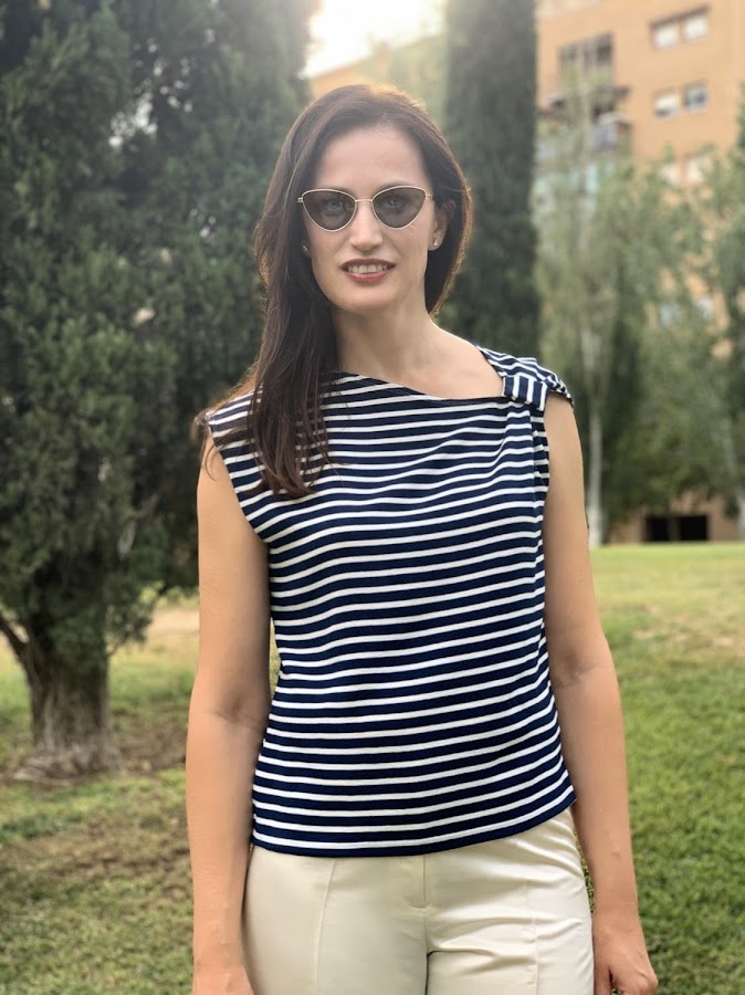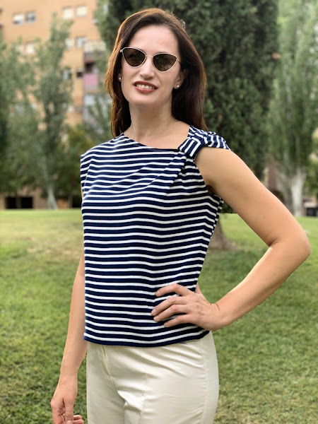 Y aquí tienes mi versión, con el adorno en el hombro y la cinta jugando con las rayas a contrasentido. No tiene más...