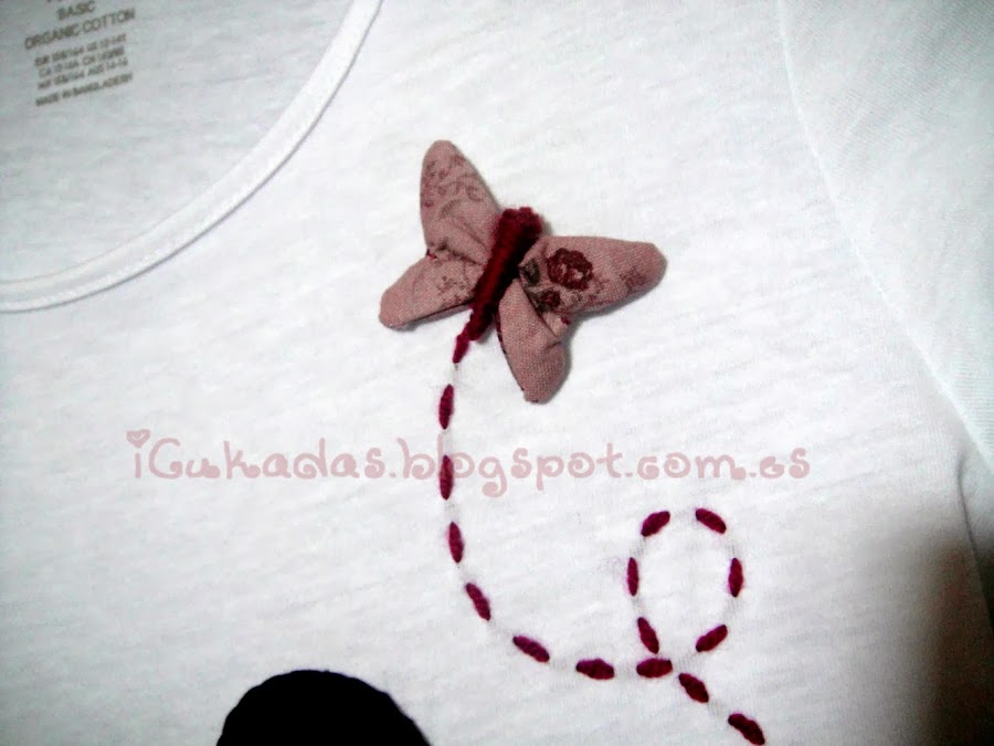 Para rematarla, le hice una mariposa en relieve, que podría haber sido un broche, igual que la flor del pelo y le bordé unas florecillas.