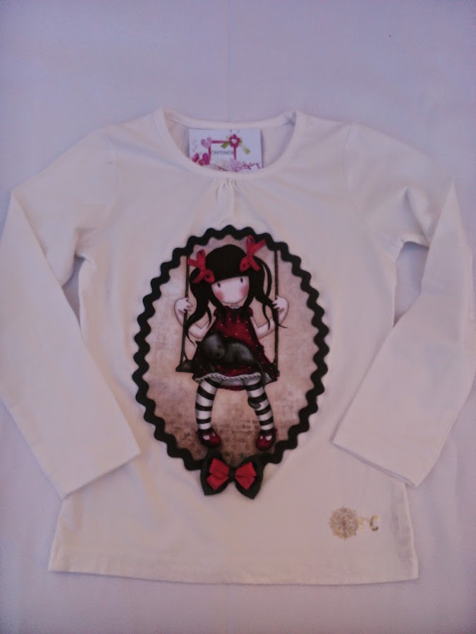 Los pasos a seguir son: - Pegar la aplicación a la camiseta con la fiselina, utilizando la plancha. Recortar la fiselina del mismo tamaño que la aplicación , en mi caso es un óvalo. - Hilvanar la piculina a todo el borde de la aplicación, teniendo cuidado de opillar el borde y de que no se vea por las ondas. - Pasar a máquina la piculina, para que quede bien fijado. - En la unión de la piculina hacer una lazada con el lazo verde, y podeis poner uno mas pequeño en burdeos, eso ya a gusto de cada uno. Yo lo he hecho doble. - opcional, hacer dos lacitos mini, y coserlos a las coletas de la muñeca. En la muñeca de esta aplicación me parecia ideal poner dos lacitos a las coletas, pero todo depende de la aplicación que tengais y la imaginación de cada uno. ..