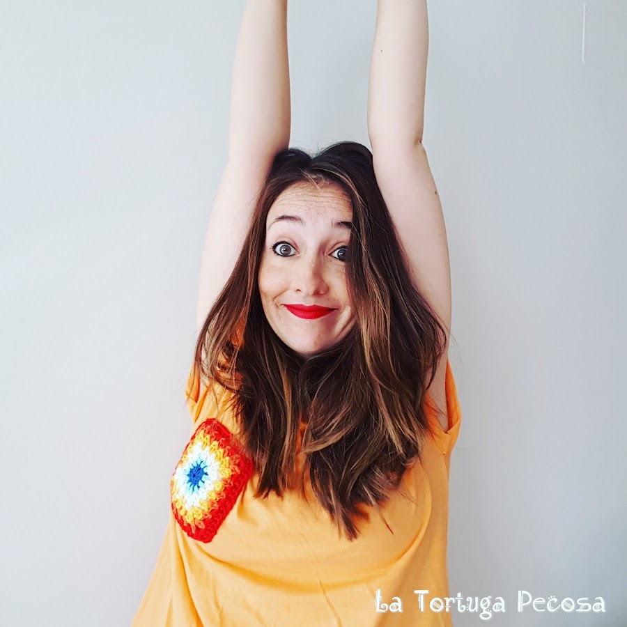 Hoy traigo un trabajo muy divertido: customizar ropa, en concreto fusión de cambio de look en una camiseta + granny square. Resulta que una camiseta básica naranja combinada con un cuadrado de granny square, puede quedar así de molona como en la foto. Como veis, es superponible y alegra aun más la camiseta.