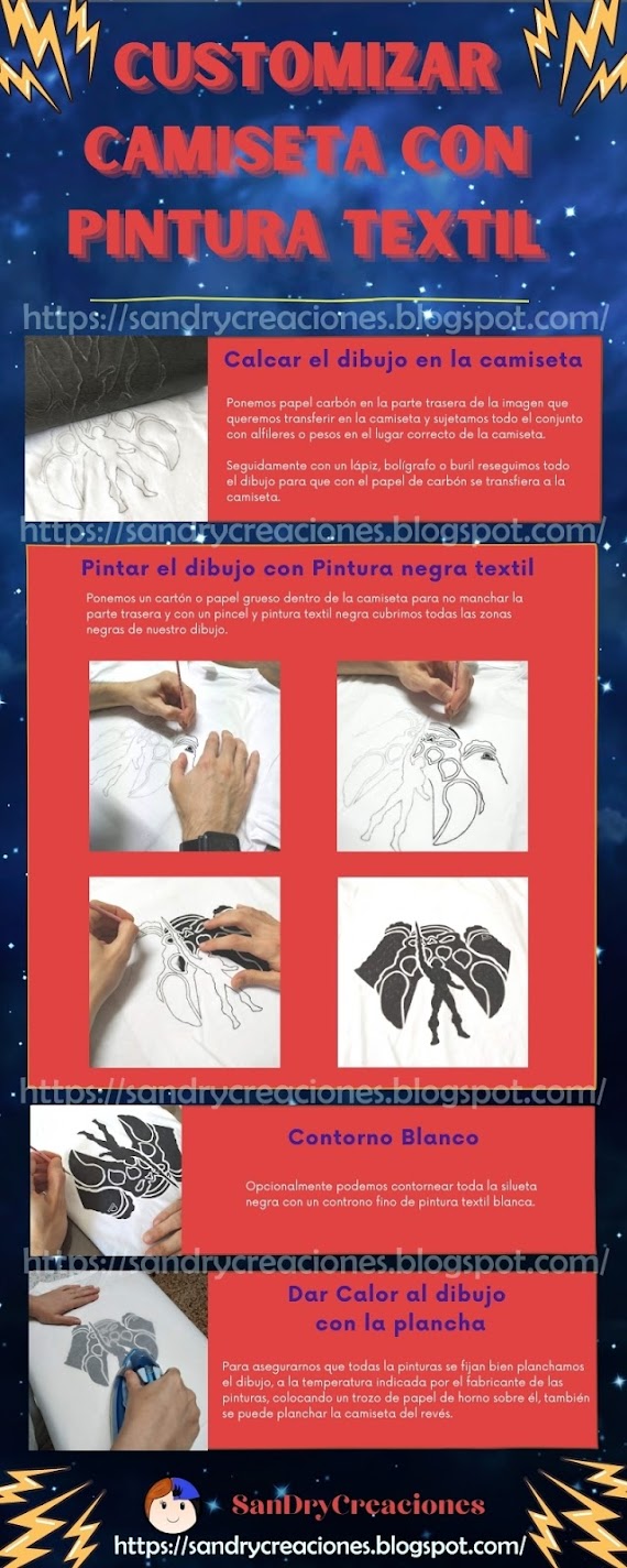 Como ya hicimos el paso a paso detallado en el post: "Camiseta de Heidi Customizada con Pintura Textil" no queremos repetirnos, así que para este paso a paso os dejamos un resumen a modo de infografía.