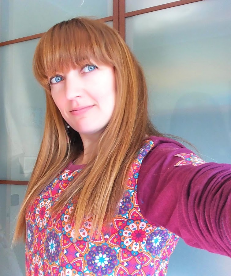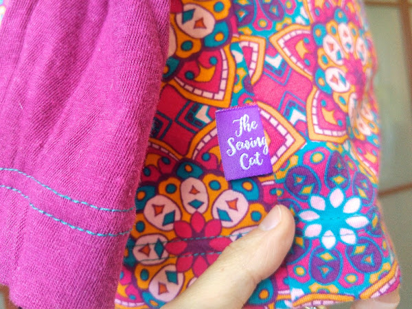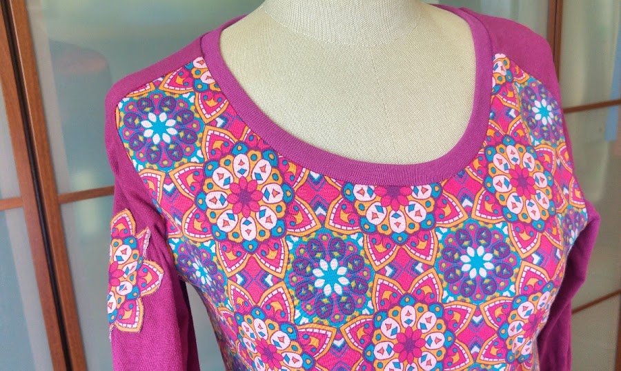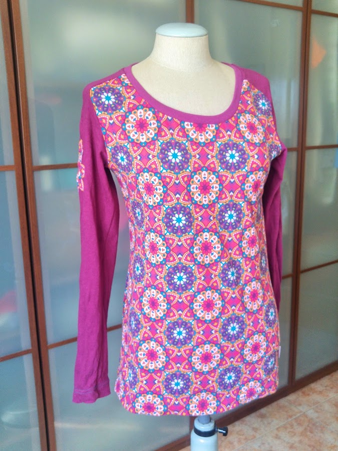 La mía, una camiseta básica, para cada día, con una tela de punto de camiseta con estampado de mandalas chulísimo, de Cal Joan, combinado con un punto liso de color berenjena, en la manga añadí una aplicación de uno de los mandalas de la tela estampada, entretelada y cosida despacito, disfrutando cada puntada.