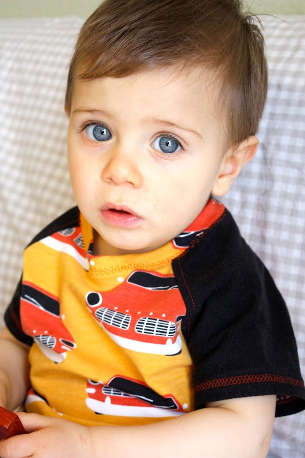 En un primer momento le puse el biés en negro pero luego al hacer la segunda camiseta vi que me gustaba más como quedaba con la tela de los coches y corte una tira al biés de la misma tela y con ella remate el escote de las dos camisetas. Usando además una puntada decorativa que veréis en las fotos con modelo.