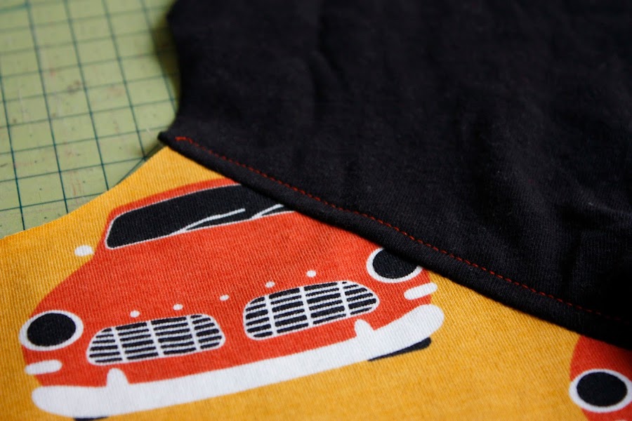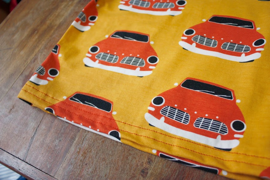 Los pespuntes decidí darselos en naranja a juego con los coches para que destacará. Os voy a explicar paso a paso como confeccionarlas con una máquina de coser normal doméstica sin necesidad de una overlock. (Todo hay que decirlo con la overlock todos los remates quedan mejor y para coser este tipo de tela de camiseta es perfecta, porque cose y remalla a la vez por lo que es rápidisimo de confeccionar).
