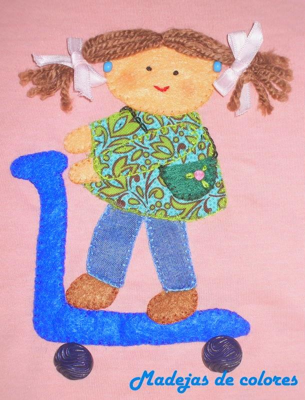Así que pensé en hacerle una camiseta con una muñeca aplicada, que había visto por la red, pero a la que le puse mi sello personal, añadiendo algunos detalles, como el bordado del bolso y el asa en punto cadeneta, además de unos pendientes, ya que su dueña es muy coqueta.