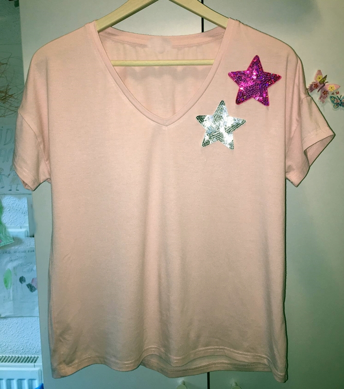En esta ocasión opté por una camiseta rosa que en principio parecía de lo más sosita, y ha mejorado bastante con estas estrellas de lentejuelas.