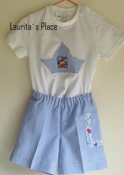 La camiseta en una básica de tienda de deportes. Lleva una aplicación en forma de barco y encima le he pegado un aplique con un dibujo de un barco que he comprado en una mercería en Avilés de esas que te encuentras fuera del centro y tienen cosas muy interesantes..