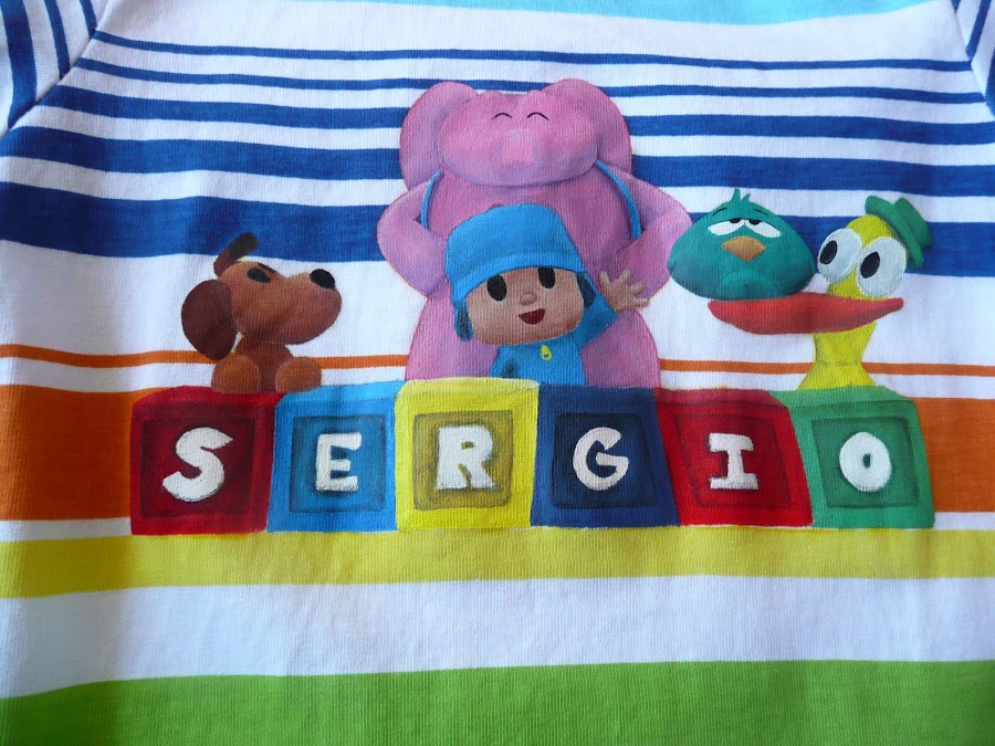 Esta camiseta se la pinté al niño de nuestros amigos que tiene un añito y 5 meses. Nos cuentan que ahora cada vez que le dicen "pocoyo" él se busca en su camiseta jajaja y que ademas le encanta ponersela :-D