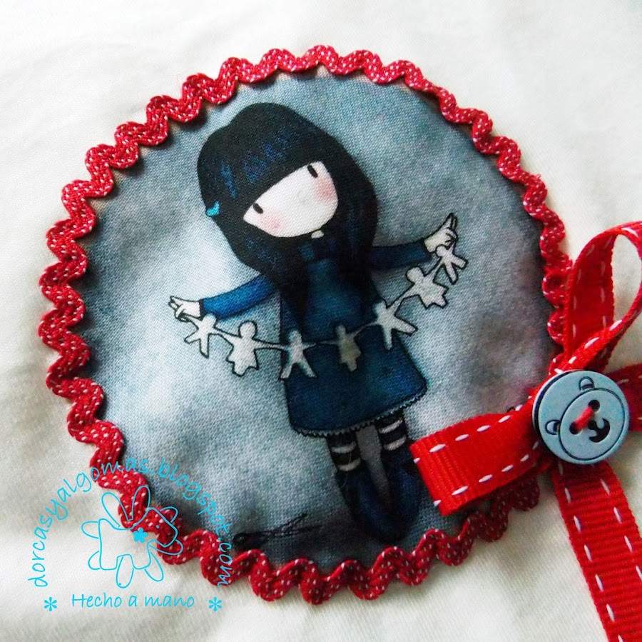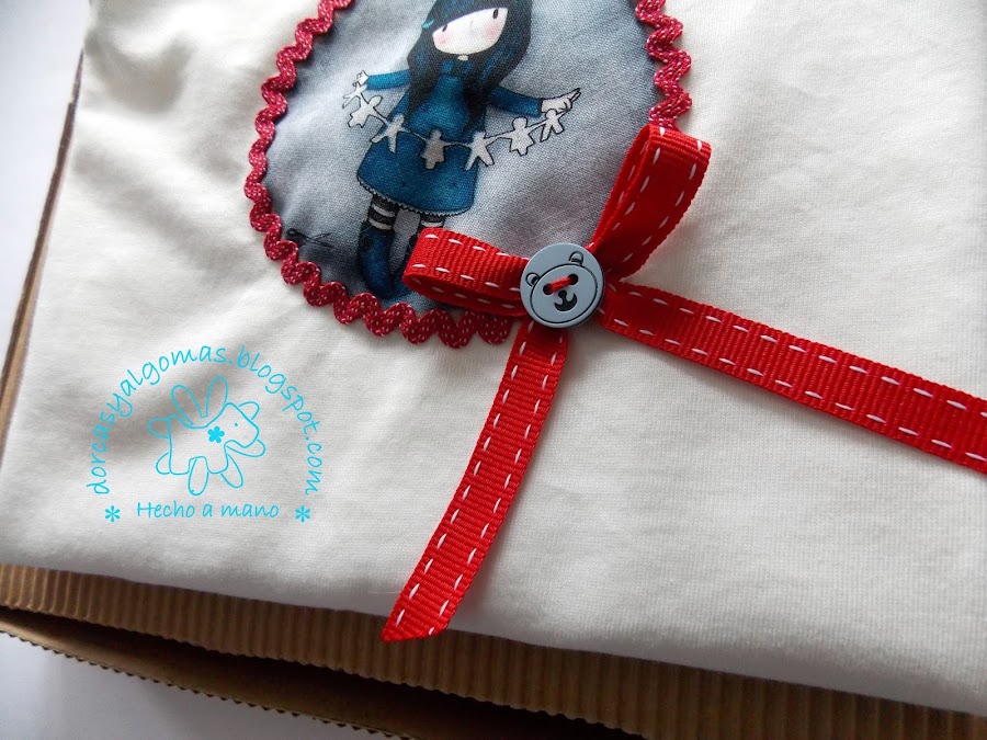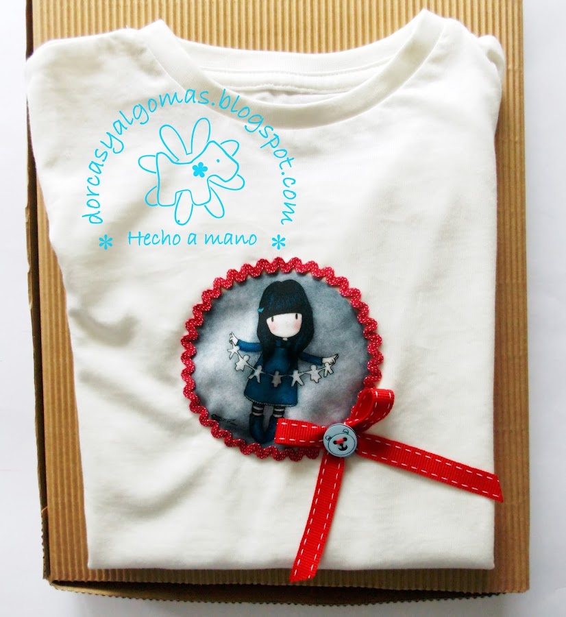 Hoy nos vamos a la costura con una camiseta para niña. Está realizada con un motivo textil de las muñecas Gorjuss. Va rematado con una cinta de zig-zag y con un lazo y botón a juego.