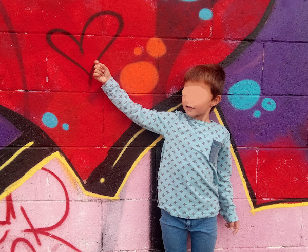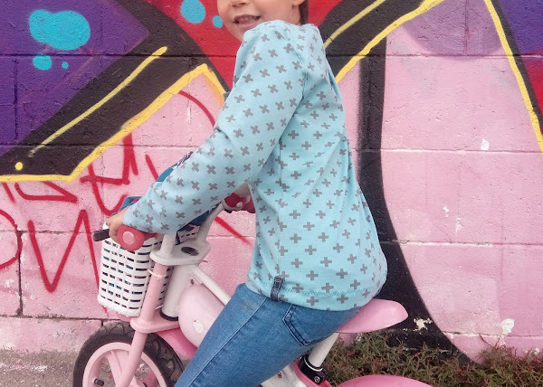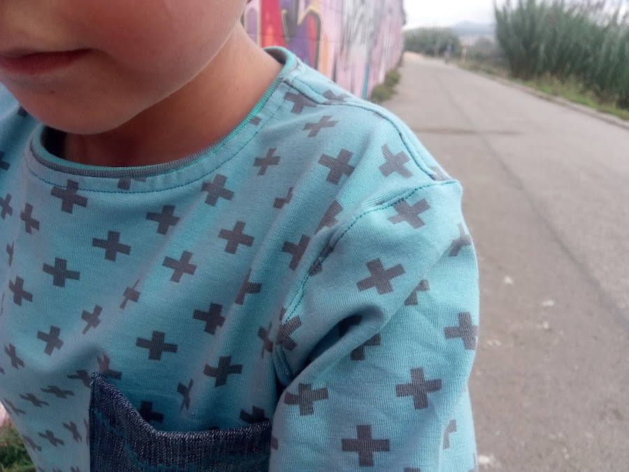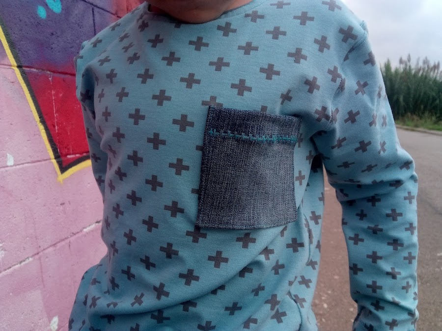 Y le hice un bossillo tejano... con puntada decorativa azul. El patrón de esta camiseta de la última ottobre niños, en el recopilatorio de Fans de Ottobre 6/2017 la podréis ver, habrán mas? no se... Yo tenía esta revista a mano en casa de mi madre y sin pasar por agua la tela, fue directa a la tabla de corte jijiji.