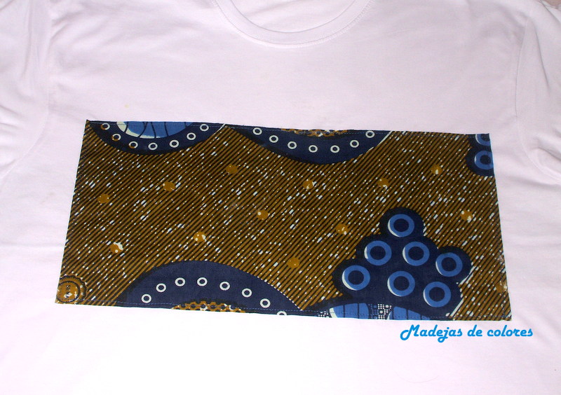Y por último, también escogí un dibujo de la tela, para aplicarla en una esquina. Si se fijan, es la misma tela que he utilizado en otras ocasiones, para cartera y camiseta (África), sólo que esta vez, en lugar de ser amarilla es turquesa. Ya les decia, que esta tela da mucho juego.