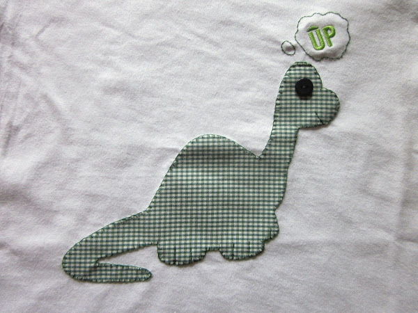 LA PRIMERA ES UNA CAMISETA CON EL LOGO DE UNA TIENDA DE DEPORTES, QUE AL ESTAR BORDADO NO QUISE QUITAR PARA NO ESTROPEARLA. POR ESO, DECIDÍ APROVECHARLO. Y ASÍ QUEDÓ ESTE DINOSAURIO DE PENSATIVO...