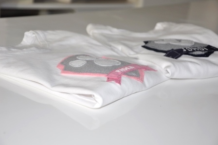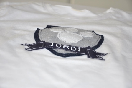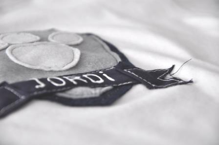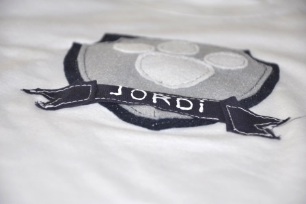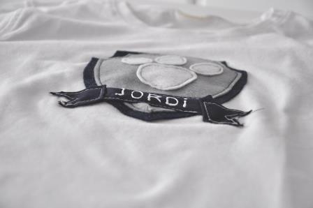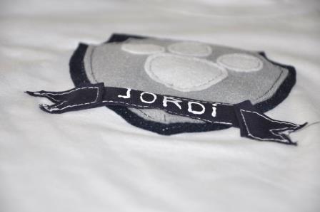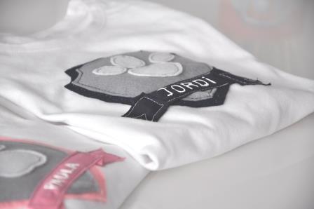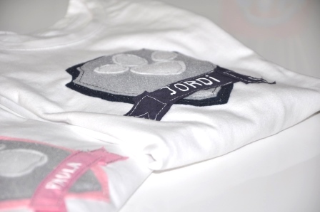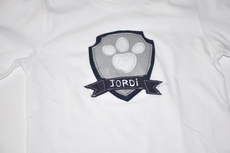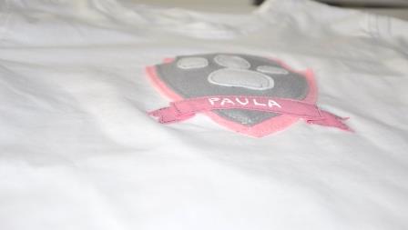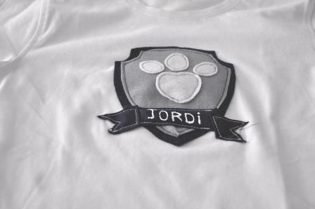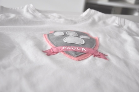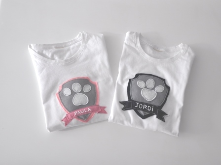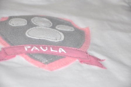 Teniendo en cuenta que la Patrulla Canina es multicolor y que no quería hacer algo muy cargado, opté por hacer un escudo en azul y gris para Jordi; en rosa y gris para Paula, la huella de los perros y el nombre de cada uno.