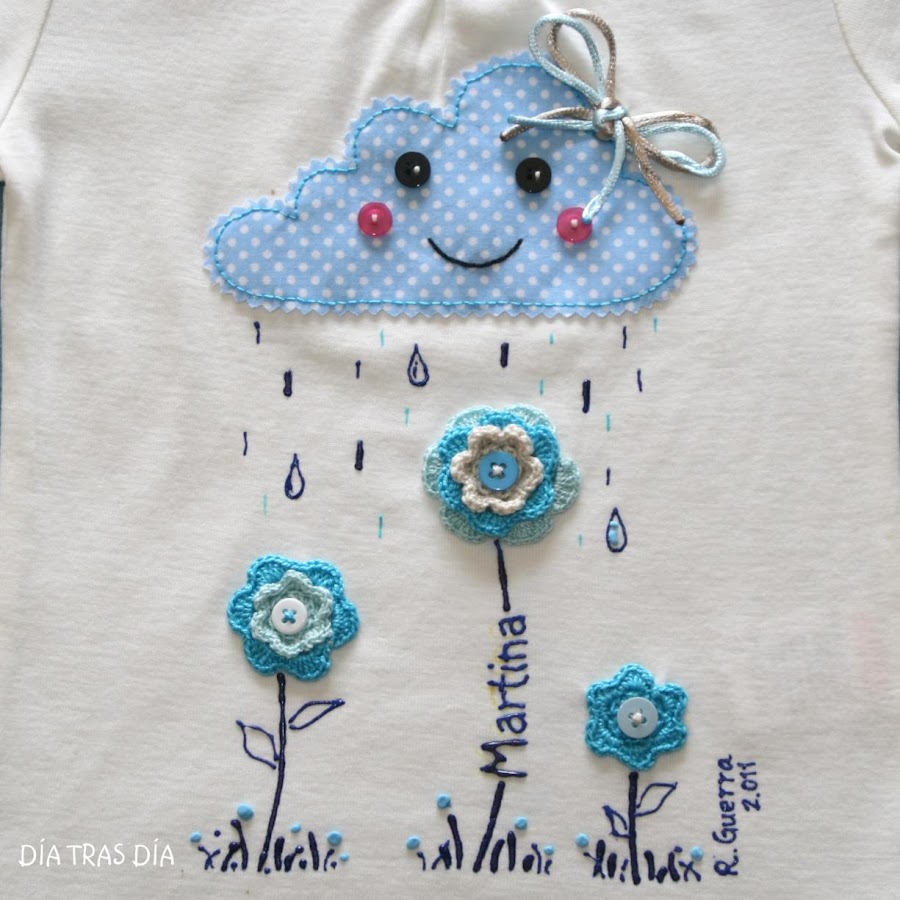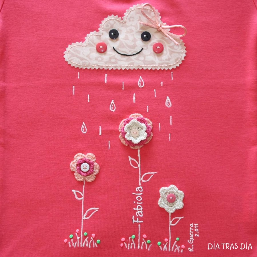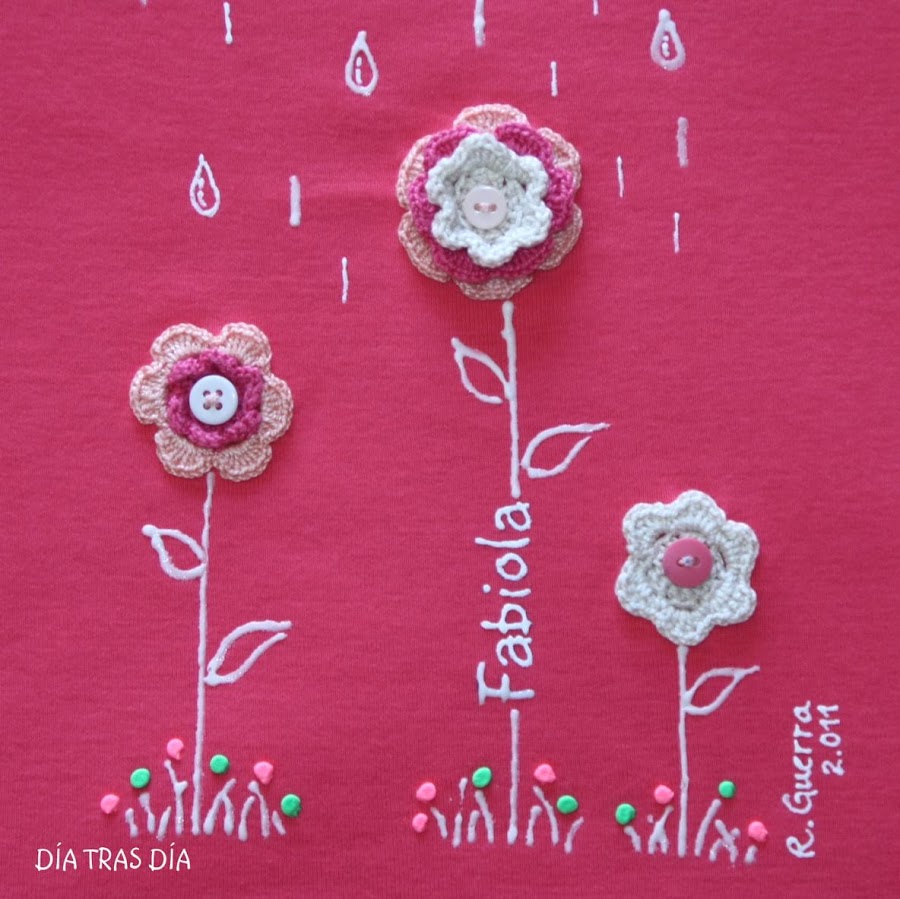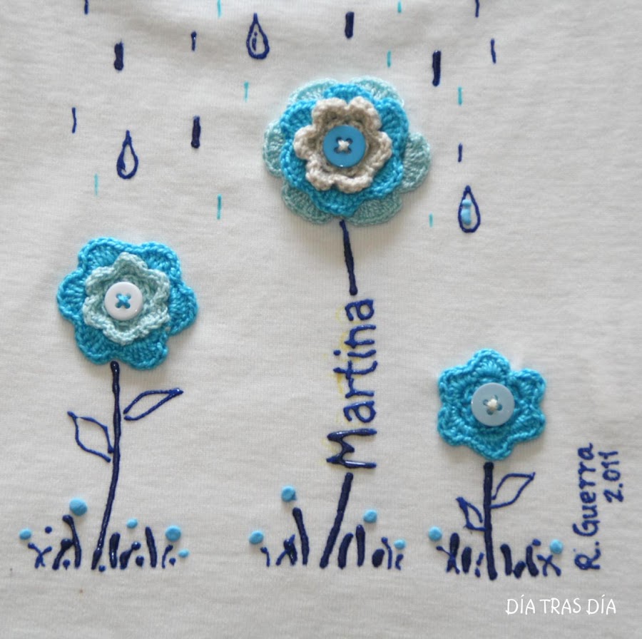 El dibujo de la camiseta ya os resultará familiar, ya que se trata del modelo "En Abril, aguas mil...". Sin embargo, esta vez tienen algo distinto: las he personalizado con el nombre de su destinataria.