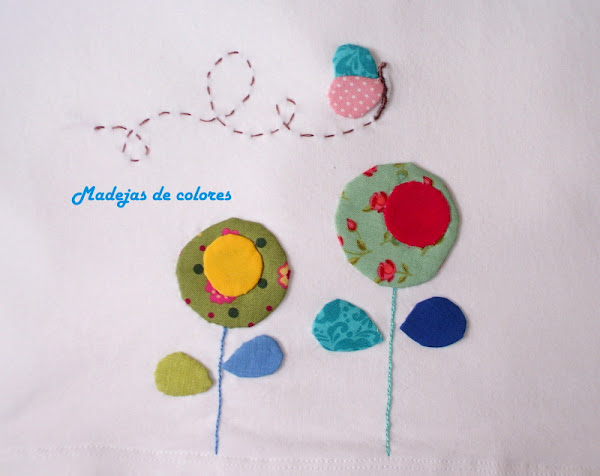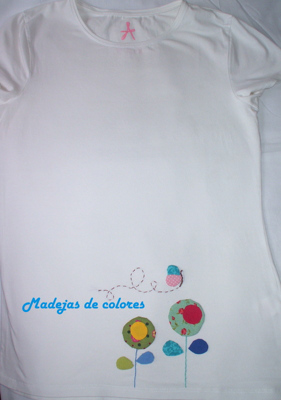 Unas florecitas estilo naif (como me encanta este estilo),de colores alegres y con una mariposa revoloteando sobre ellas, a punto escondido. Me costó lo suyo, pues la camiseta es de punto y cedía.