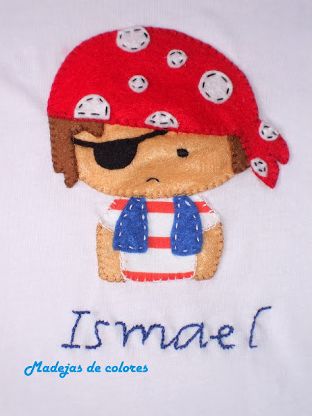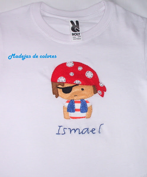 La otra camiseta es para un peque de 5 añitos y el dibujo que elegí, es un gracioso pirata, combinando tela y fieltro, a festón.