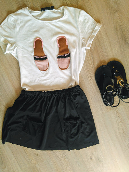 Y esto no es todo, quería ponérmela con una falda negra y no tenía ninguna!!!. Menos mal que me quedaba un poco de tela y me hice una falda rápida para la playita este verano, con un par de bolsillos y cinta igual que la camiseta. De esta manera quería resaltar la camiseta y que s eviera más que el resto de la ropa.