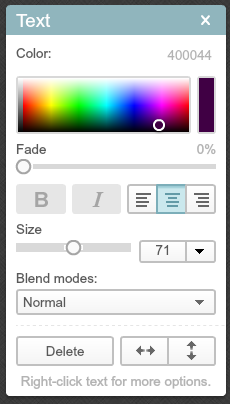 En este menú podrás modificar tu texto. Puedes cambiar el color, el tamaño (en Size), ponerlo en cursiva o en negrita... Juega con las posibilidades y personalízalo a tu gusto.