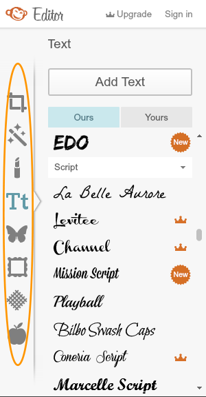 Nos aparecerán un montón de tipos de letras distintos. Los que tienen una corona naranja sólo están disponibles para los usuarios premium (de pago).