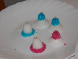 PASO 3: Vamos a coger el alambre y lo ponemos dentro del molde de la campana con las puntas hacia nosotros. Lo sostenemos con un dedo para mantenerlo en el medio del molde y colocamos azúcar. (Imagen 8)