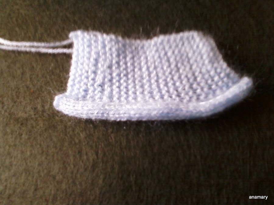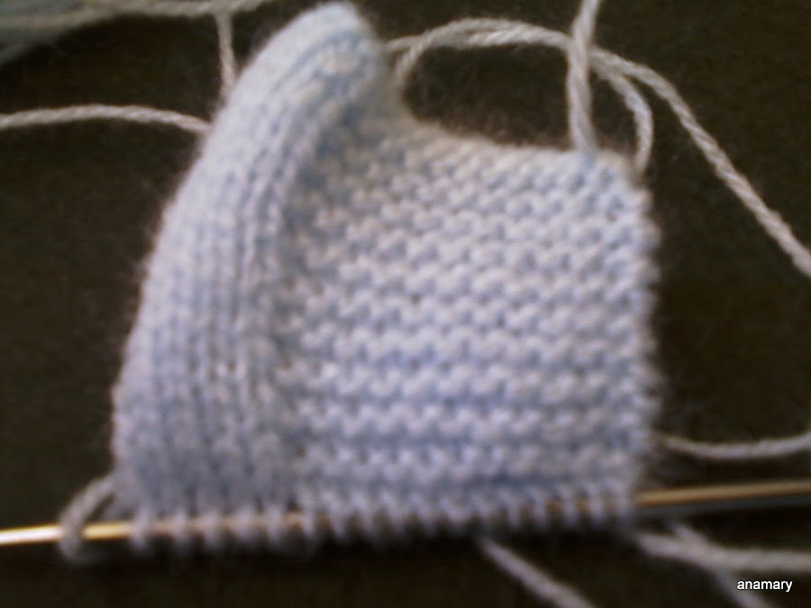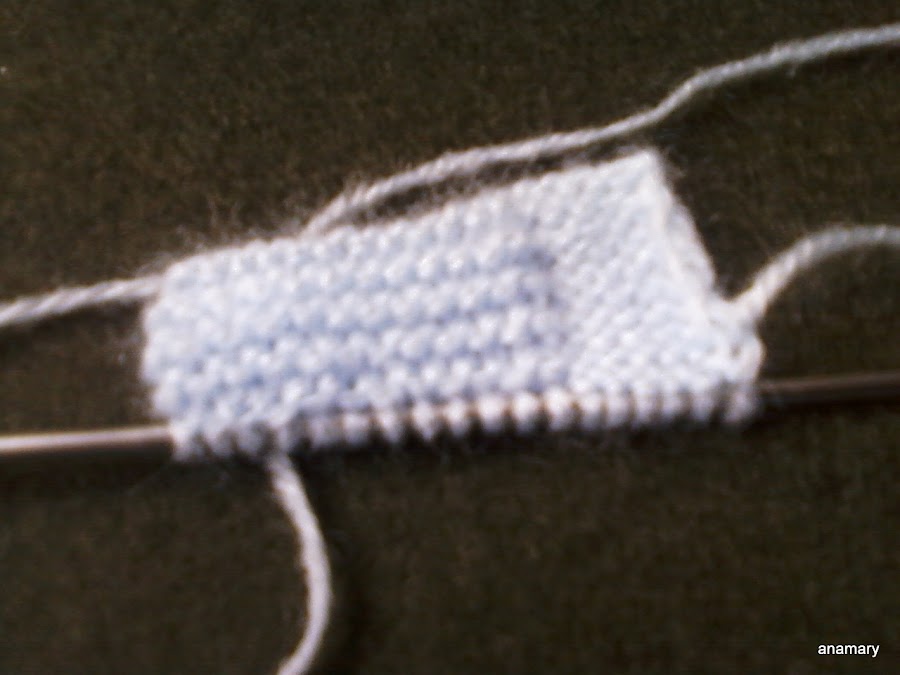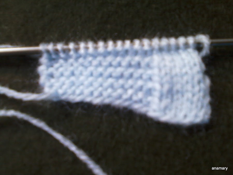 realización :montamos 18 puntos ,y trabajar los 12 primeros puntos ,en punto musgo(todas las vueltas del derecho ),y los otro 6 puntos a punto jersey (una vuelta derecho,una vuelta revés ),pasar siempre sin trabajar el primer punto,