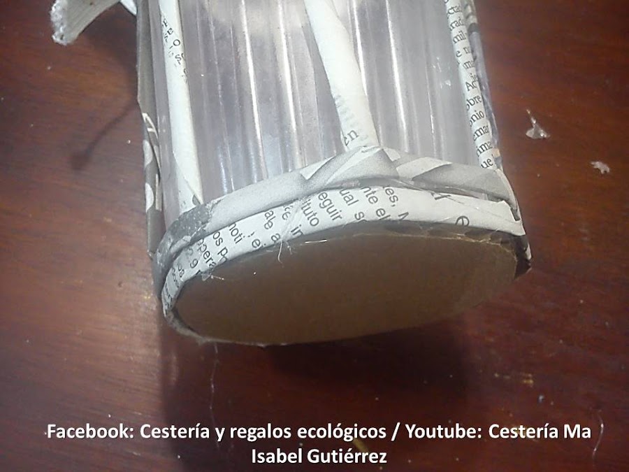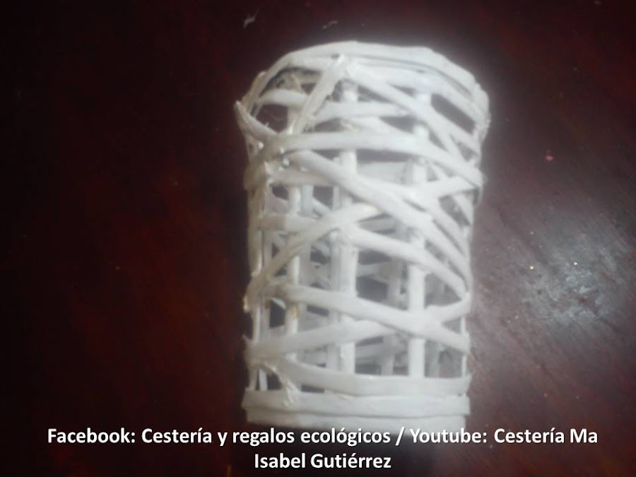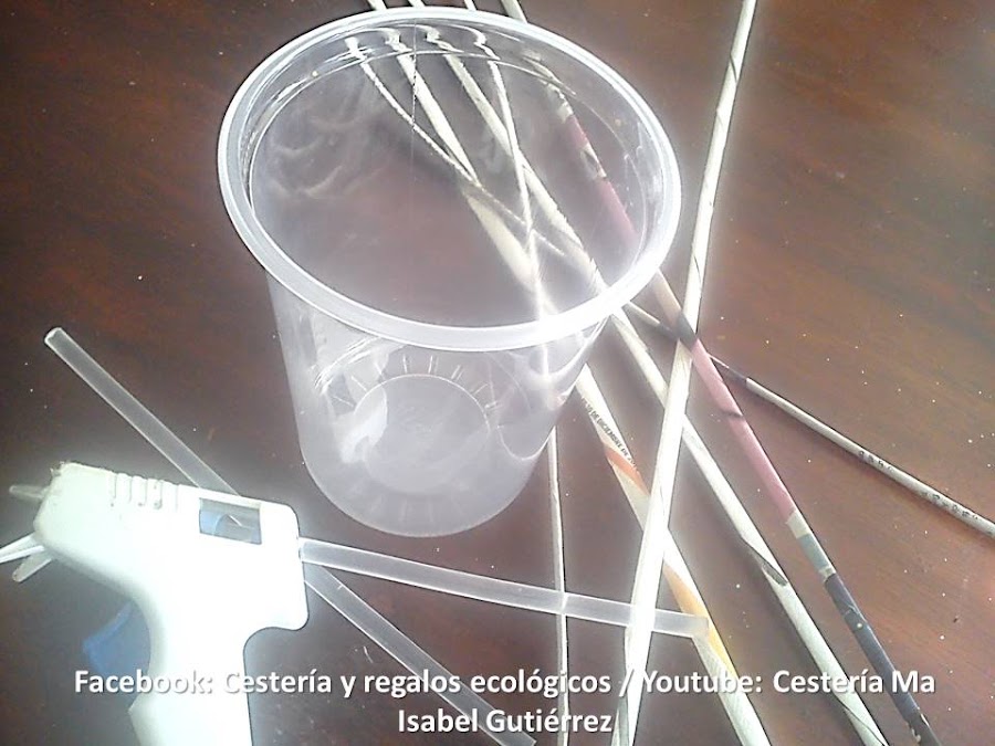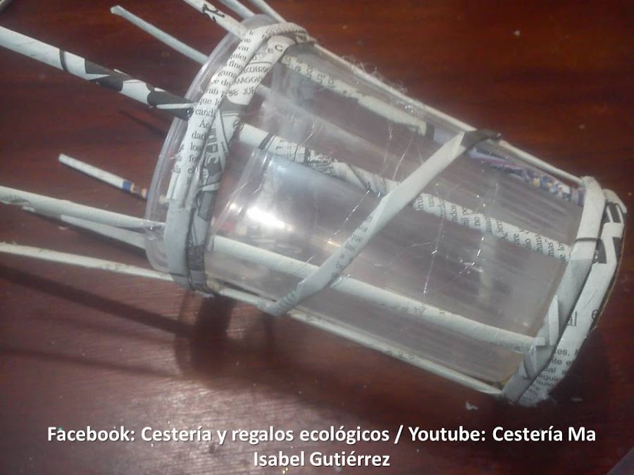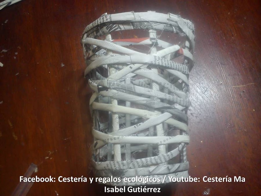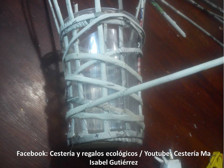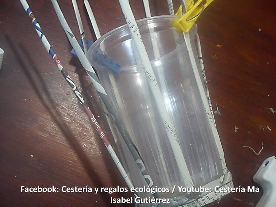 Pegamos dos vueltas más de varillas de papel en la parte superior, estas determinan la altura de la canasta... con lo que te sobre de varilla de papel empezamos a enrollar alrededor del molde poniendo un punto de silicón en cada varilla de papel por donde va pasando...