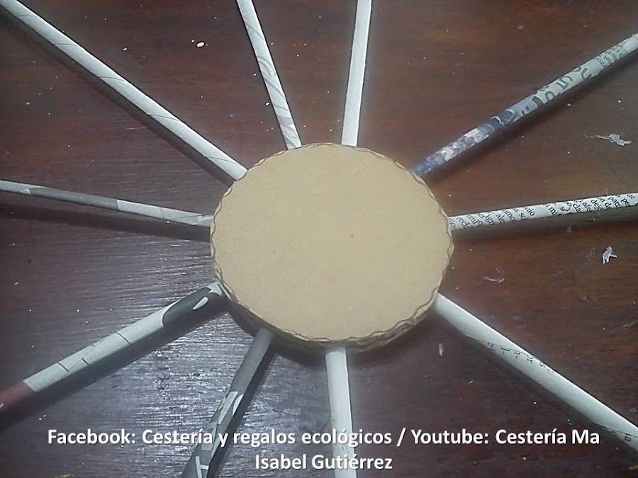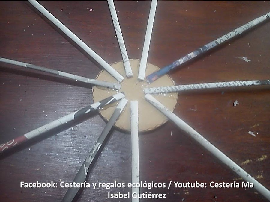 Pegamos varillas de papel alrededor de una de las ruedas de cartón, dejando un espacio entre una y otra varilla de aproximadamente 3 cms... estas varillas de papel deben ser tan largas como grande desees la canasta...