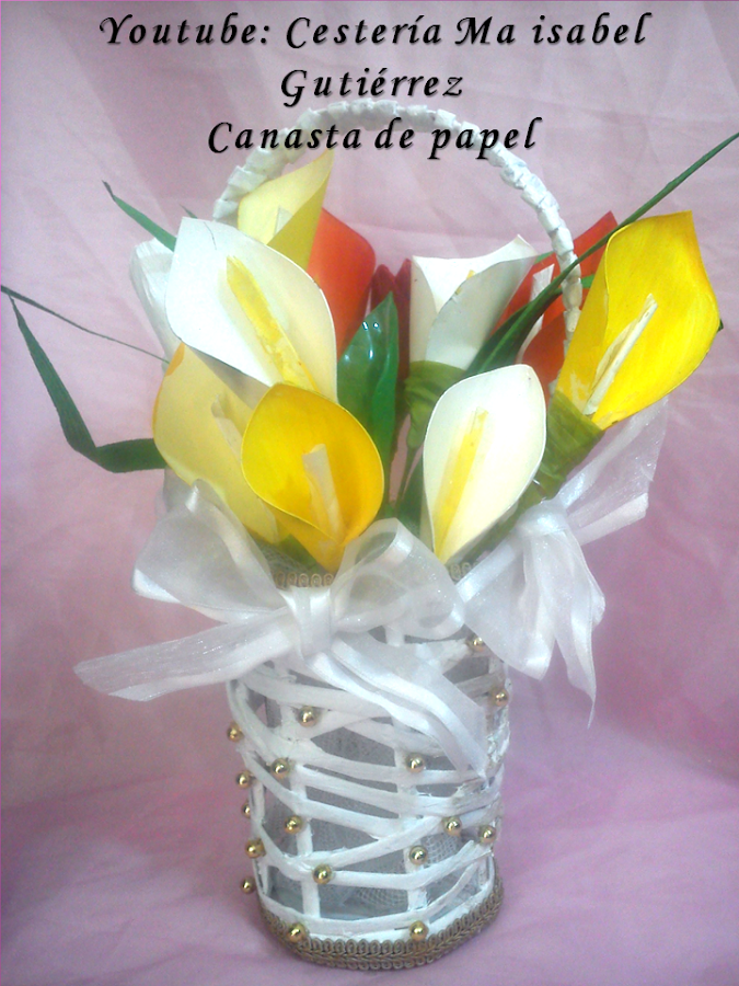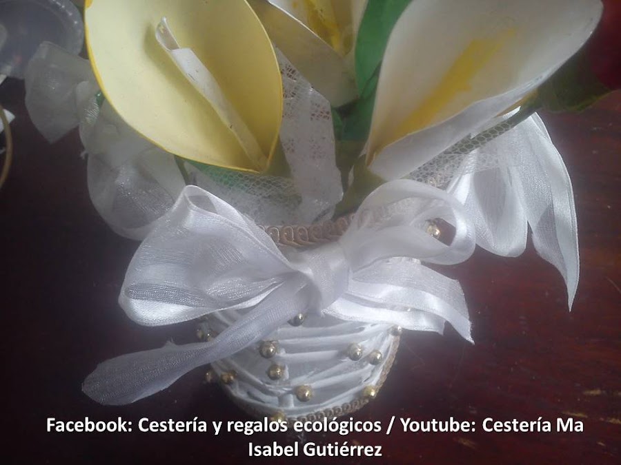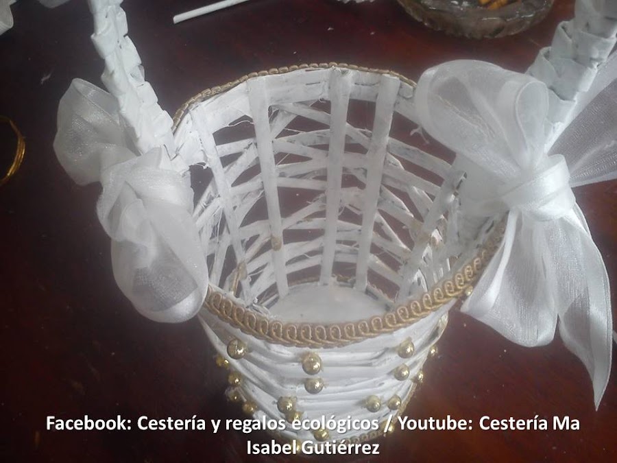 La canasta la decoramos pegando un listón o cinta bonita en la base y en la parte superior, y opcional, pegamos falsas perlas (de plástico) alrededor de la canasta, también pegué lazos de listón a cada lado...