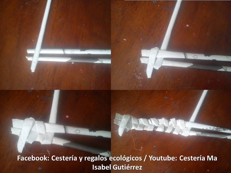 Hacemos el asa con dos varillas largas de papel que acomodamos una al lado de la otra dejando un espacio entre ellas de aproximadamente 1 cm., pegamos encima otra varillas de papel y empezamos a tejer pasando la varilla como "abrazando la varilla de abajo, pasamos por abajo de la varilla de arriba, "abrazamos! y luego la pasamos por abajo... y ese será el patrón para ir tejiendo hasta obtener el largo deseado del asa...