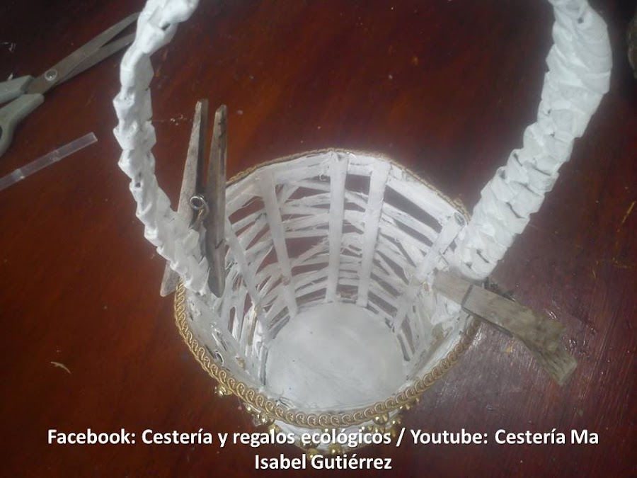 Pegamos con silicón los extremos del asa en la canasta, ponemos unas pinzas mientras seca...