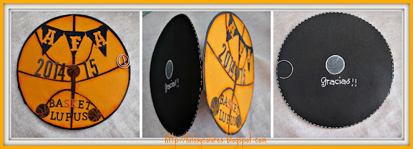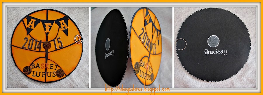 Y mientras espero, me he acordado que ya os puedo enseñar la última tarjeta que he hecho.La hice para el entrenador de baloncesto de mis hijas,ya que el pasado domingo tuvimos la comida fin de temporada,y las chicas le entregaron un regalo.La verdad que,al principio,no sabía que hacer,pero de pronto me acordé,que mi amiga Esther López,hace un tiempo me cortó con su cameo,para hacer una caja con forma de balón de basket,y entonces me vino la inspiración,eso sí...sin cameo,así que tuve que hacerlo a mano,creó que a Juan(el entrenador)le gustó,espero que a vosotr@s también os guste: