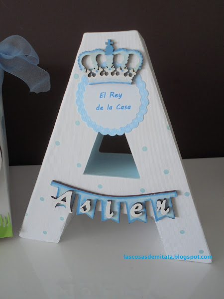 Canastilla de madera decorada para el dormitorio del pequeño Asier junto con inicial de cartón, fue un encargo de hace ya varios meses pero que tenía muchas ganas de mostraros porque me encantó el resultado.