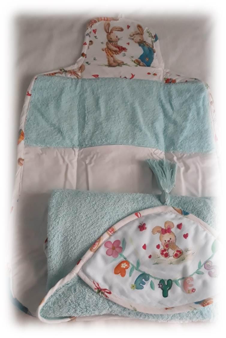 La toalla es de algodón 100 x 100, de la mejor calidad, seca rápido al bebé y la capucha está personalizada y pintada a mano, la gran borla que le he puesto la hace más graciosa aún, los bieses los hice con la misma tela del cambiador.