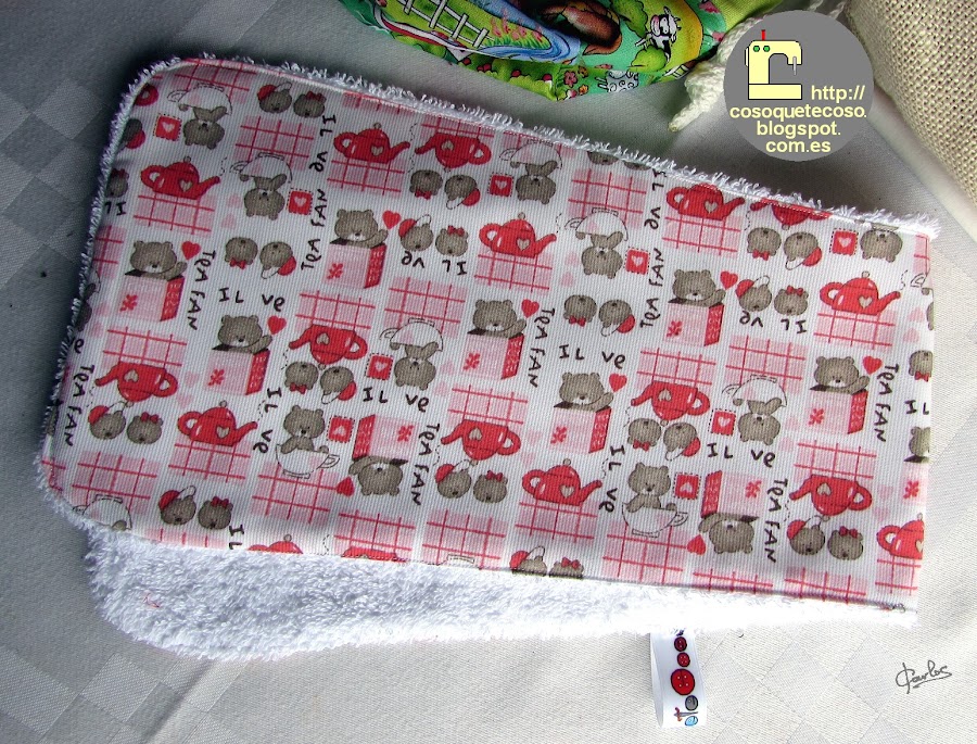 La tela de la mochila es preciosa, me la traje de Birmingham, y es de animales, en tonos verdes, al fotógrafo, como lo que le gustan son mis letras bordadas, de sacar un primer plano no se olvidó.
