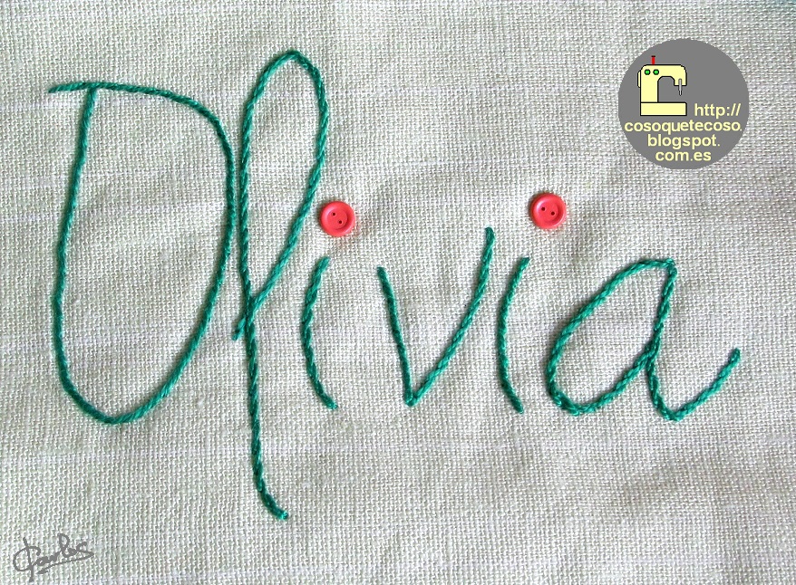 Aunque parece blanco, el nombre le bordé sobre un lino en un verde suave.
