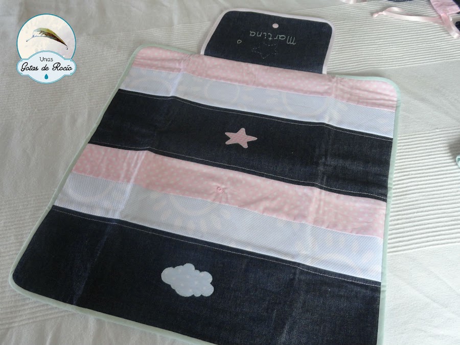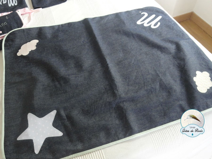 Hemos escogido para la canastilla una tela vaquera que le da un toque diferente muy bonito. Combinada con telas en tonos suaves he conseguido lo que pretendía: un conjunto que no fuera simétrico, que no fuera una tarta de merengue de cuatro pisos, jaja, pero que todas las piezas tuvieran unidad y armonía.