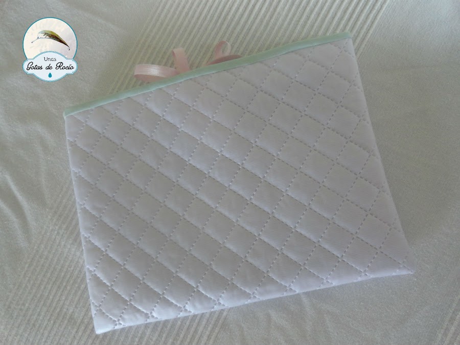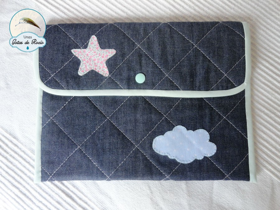 Empezamos por el portadocumentos. A Carmen le gustó mucho el de Álvaro y Claudia (lo puedes ver aquí), así que decidí escoger nubes y estrellas como motivo a repetir en las distintas piezas.