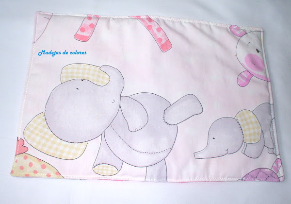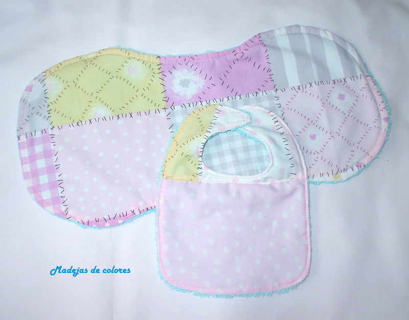 Seguimos con otra toalla, pero esta para la lactancia y babero a juego. No consigo sacar los tonos reales, les prometo con son más alegres de lo que se ven.