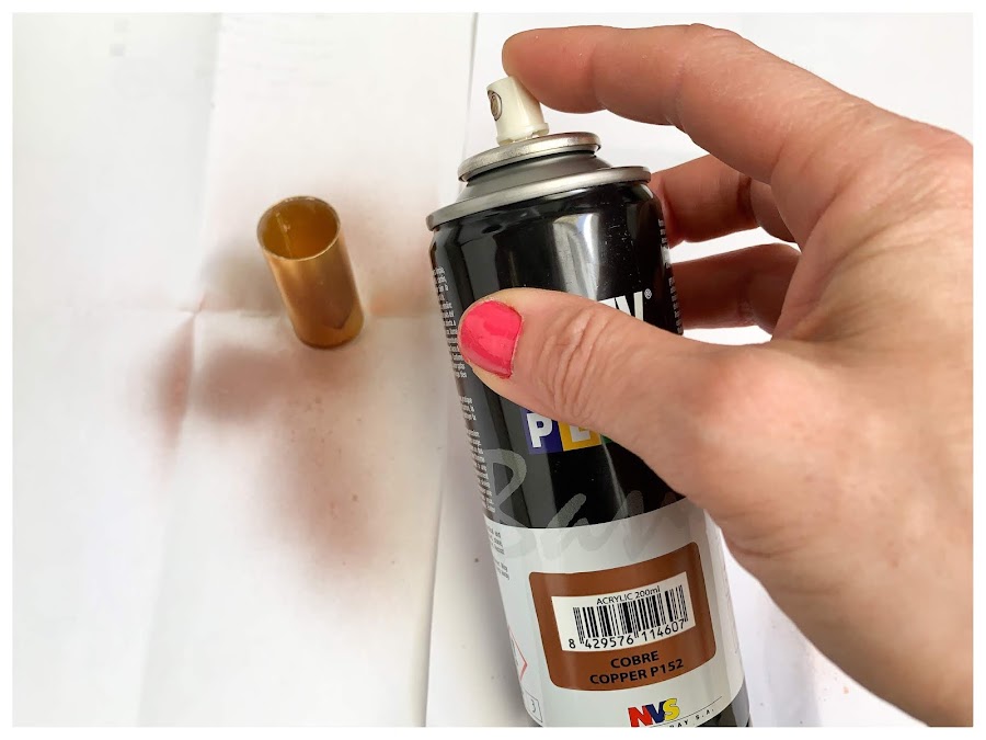 Con el spray de color cobre, pintar el tapón del tarro del bote de perfume reciclado, y
