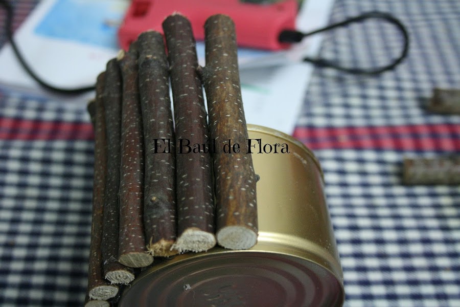 Después de tener nuestra lata preparada, vamos pegando con la pistola los palos, intentando primero presentarlos, para ver la mejor manera de encajarlos y que nos quede el menor hueco posible entre ellos.