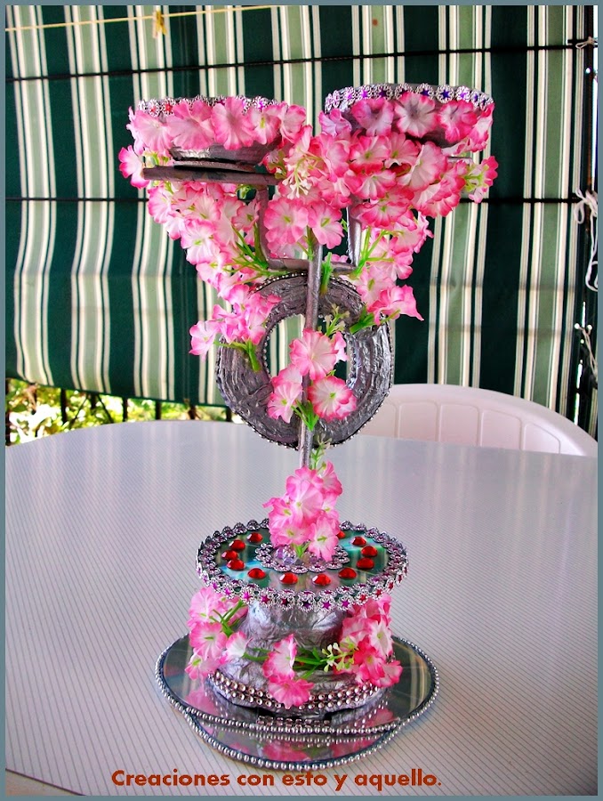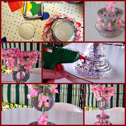 3 cds. que no se usen, 2 palitos tipo brochette y un ramo de flores. Usé el comprado en los chinos. Un Cd entero para soportar el peso de los dos que puse, y en la base cortarlos por el medio buscando la armonía de la forma.