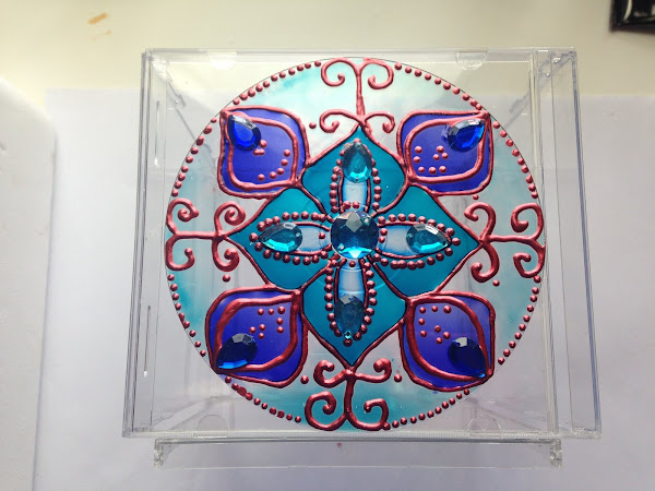 Y para finalizar en las esquinas del candelero le apliqué las mismas figuras de acrílico de los mandalas. Y trabajo terminado.