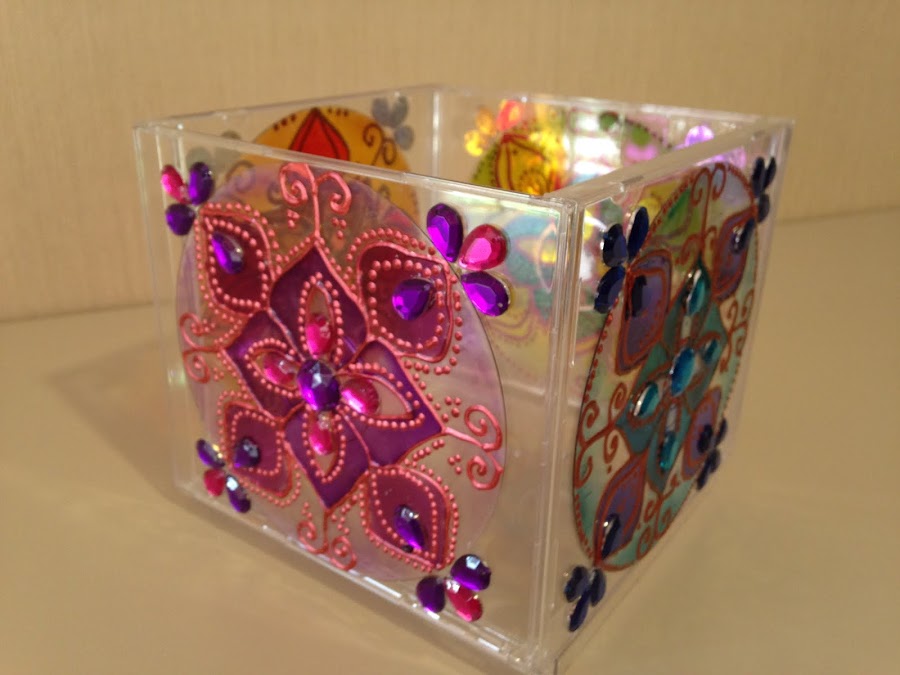 Aquí te traigo una propuesta de reciclado de ambas cosas, este candelero con forma de cubo que contiene en cada una de sus caras un mandala.