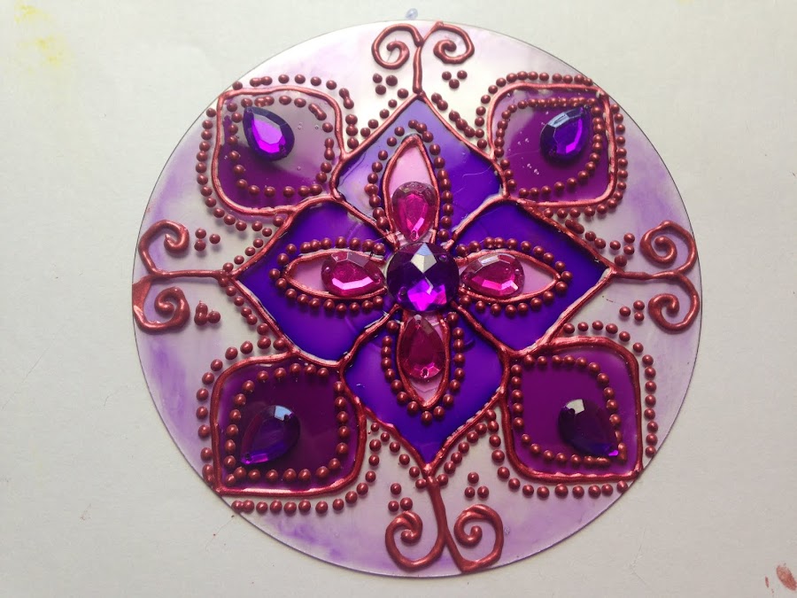 Para cada mandala usar el mismo dibujo y delinear con pintura dimensional las líneas más importantes.
