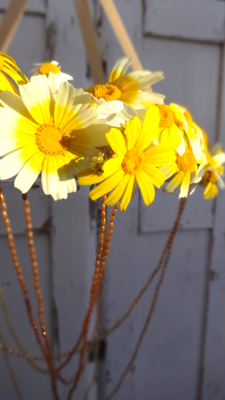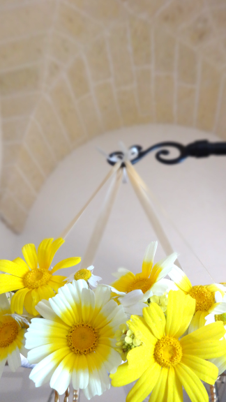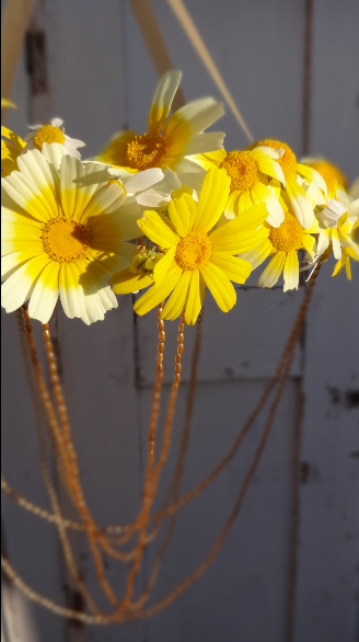 De otra manera, en el listón con el cual he forrado la manguera he atrapado los tallos de las margaritas, solo que la duración del candil es frugal, al final del día perderán su encanto
