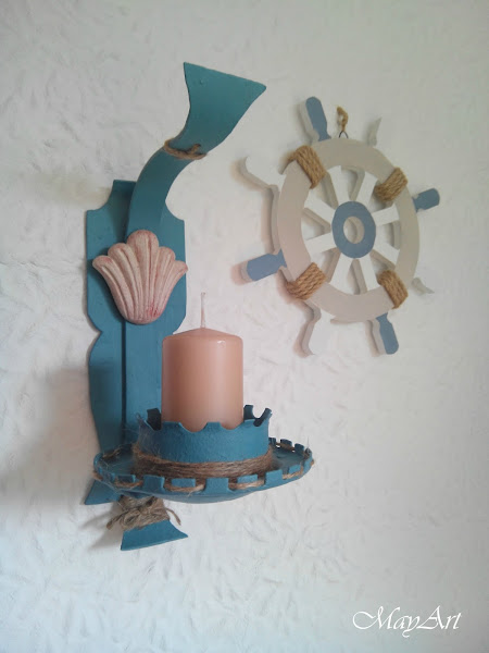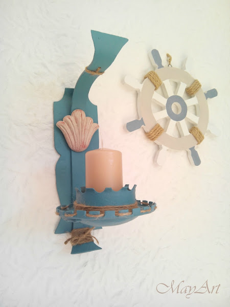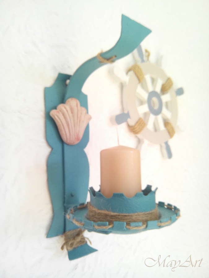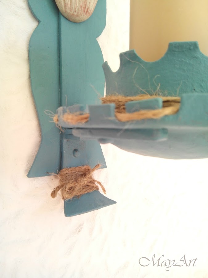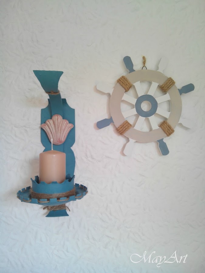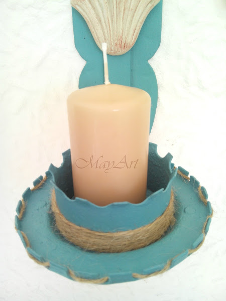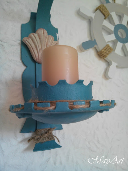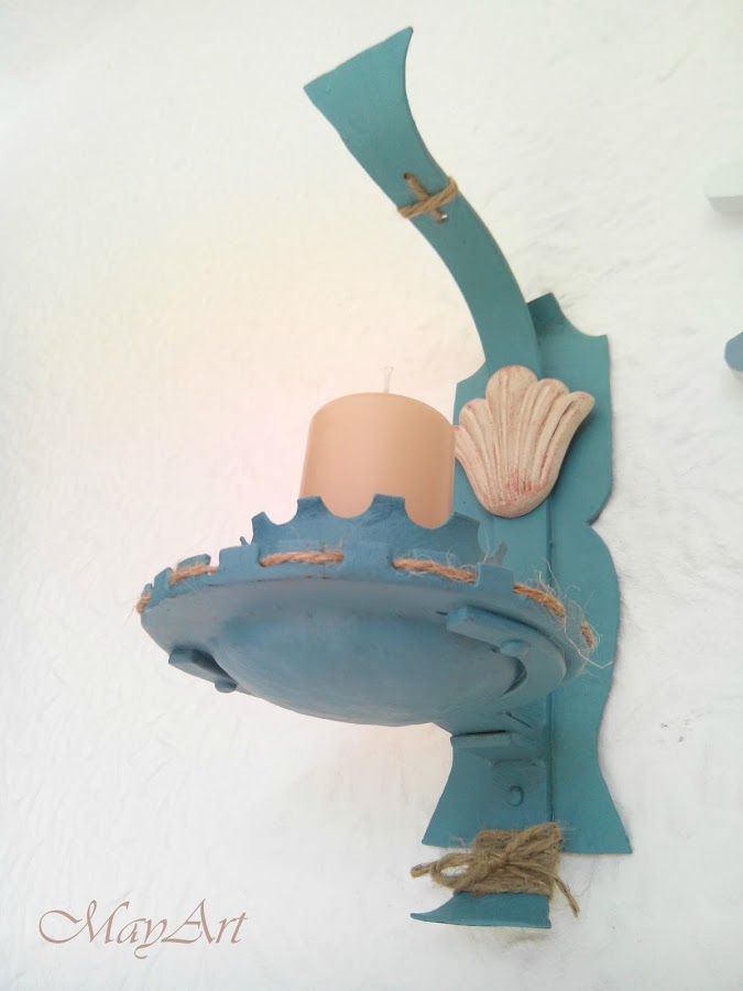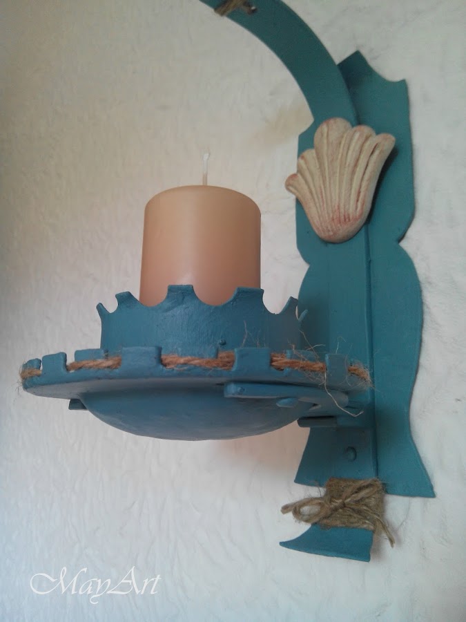 No tardé mucho en pensar la idea que estáis viendo en las fotos, con un velón y unas cuerdas de yute. Aunque en principio quería pintarlo de azul marino y el velón quería que fuera blanco, idea que luego modifiqué al contar con este tono de pintura que ya utilicé en la leja que restauré hace un tiempo.