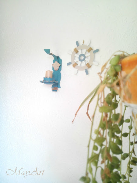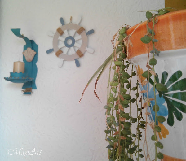 Lo cierto es que acerté con los colores, porque le hace mucho juego con el timón que tengo al lado y destaca mucho de la pared blanca del porche. ¡¡Muy coastal, verdad!!
