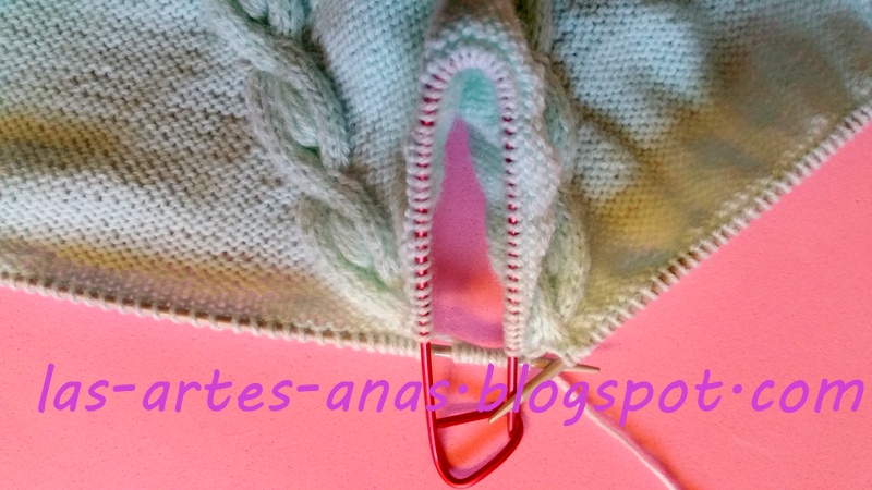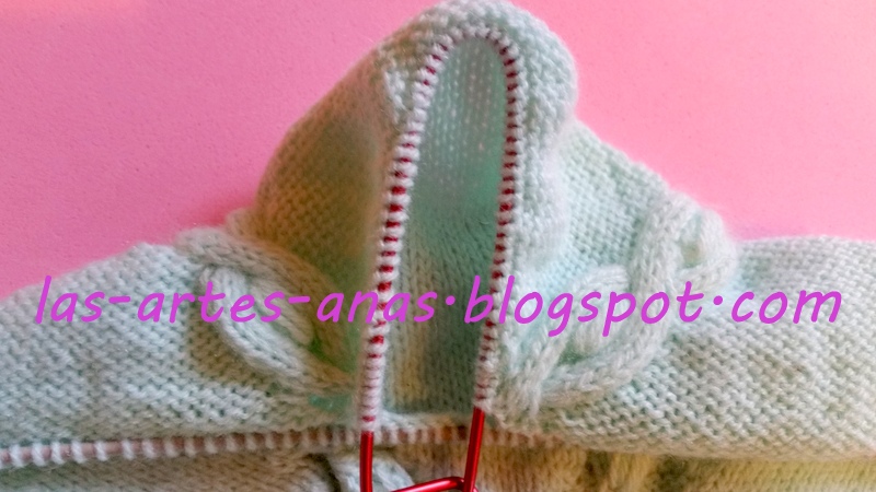 HE UTILIZADO ESTA TRENZA PINCHA AQUI PARA VER EL VÍDEO, AL PRINCIPIO DE CADA OCHO Y AL FINAL DE TEJERLO,HACER UNA LAZADA , O SEA 2 AUMENTOS EN CADA TRENZA, siempre por el lado derecho, el revés se trabaja como se presenten los puntos total: 8 lazadas o aumentos en cada pasada del derecho , 2 AUMENTOS EN CADA TRENZA